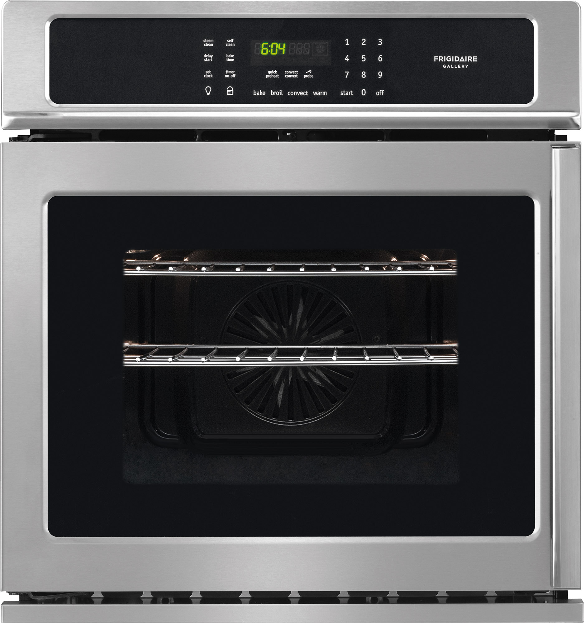 The Frigidaire Gallery 27 in. Electric Wall Oven features a large 3.8 cu. ft. oven so you have more room to cook multiple items. Express-Select Control panel makes it easy to set cooking temperature at the touch of a button and the side swing door allows you to take dishes out of the oven with ease. True Convection features a third element and a single fan to distribute heat throughout the oven for faster and more even multi-rack baking.Read More