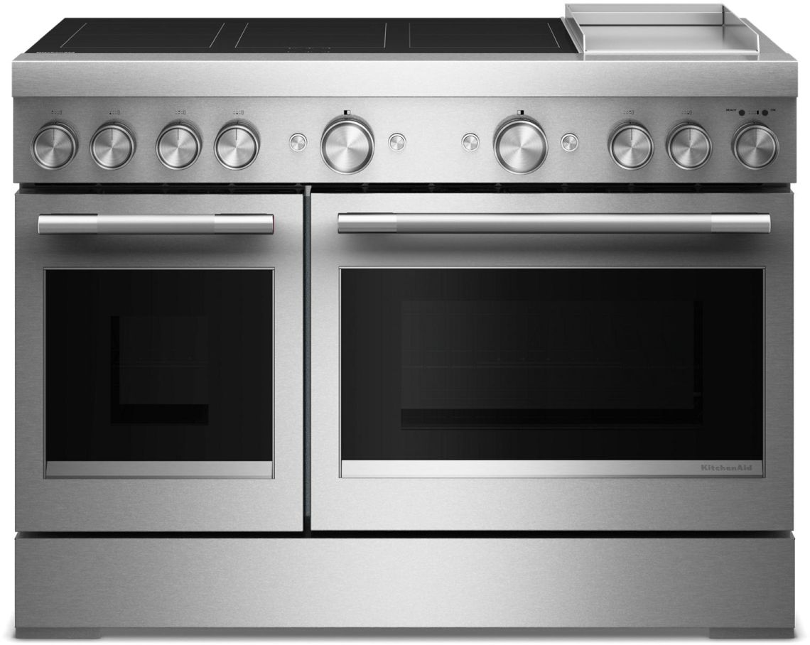 This KitchenAid® 6.3 cu. ft. 48-inch 6-Element Induction Freestanding Commercial-Style Range combines the precision of induction with the power of Air Fry. Sensor-induction cooktop generates heat directly within cookware, and the electric double oven features Even-Heat™ True Convection plus air fry mode that aids in crisping and browning.Read More