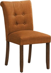 Add comfort and style to your casual family dining experience with this set of 2 upholstered, linen-look orange fabric dining chairs. Standing at a 38" height, these side chairs offer sturdy construction with the solid, brown walnut wood legs and thick foam padding on the seat and tufted, curved back, bringing some fashionable style to your dining room or kitchen.Read More