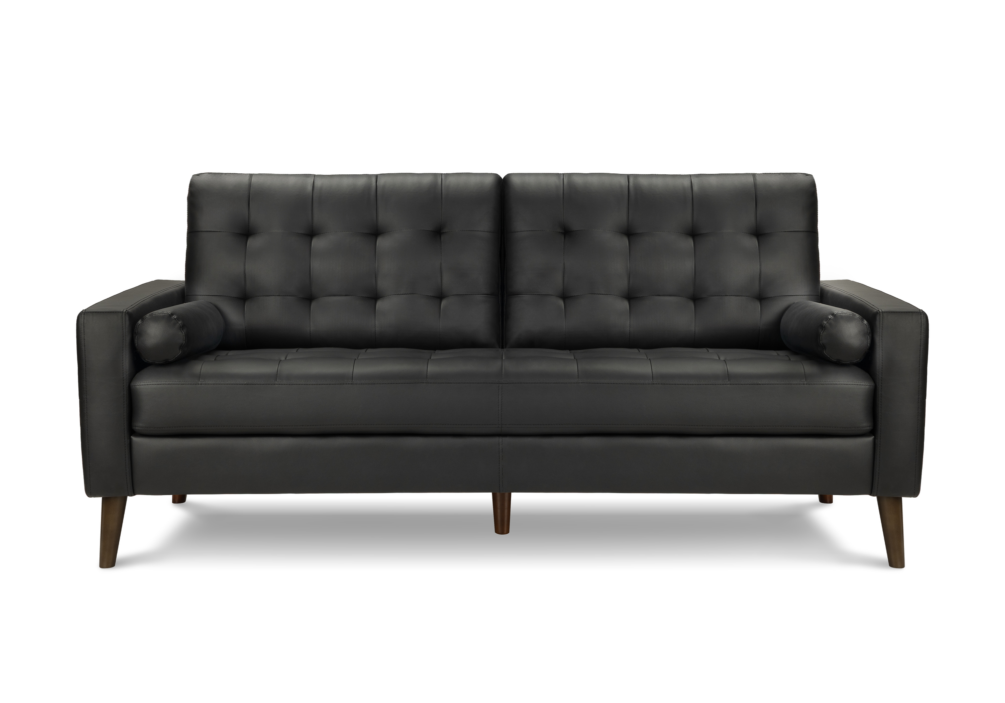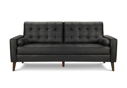 Elevate your space with this sleek mid-century style sofa, upholstered in smooth black faux leather. Compact yet roomy, this 2-seater sofa features buttonless tufting, no-sag pocket spring seats with high-density foam, and removable Dacron-filled back cushions for lasting comfort.Read More