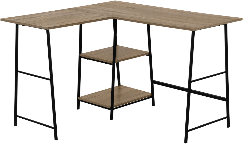 Sawhorse-style legs in metal are put to work as supports for 2 open shelves that can be used to display books, small storage boxes, or other items. This unique L-shaped writing desks' compact design and industrial style maximizes space and storage potential so that you can maximize productivity.