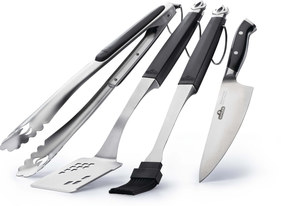 Napoleon's Executive 4 Piece Toolset is made from cast stainless steel with comfortable ergonomic handles. The only knife you will ever need, the Napoleon Executive Chef Knife is made from German steel and razor-sharp; it's the ideal all-purpose knife. The large spatula is perfect for steaks and other large food with its bladed tip to easily get under food and the serrated edge for slicing and cutting on the fly. The easy-lock stainless steel tongs are always ready for action, their comfortable grip making it easy to grasp and move your grilled delicacies. Don't forget to splash on the sauce with the silicone basting brush. Be the boss of your grill with the Napoleon Executive 4-Piece Toolset.