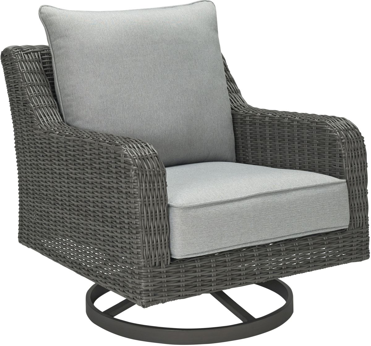Add a distinguished touch of gray to your outdoor living space with this swivel lounge chair. It's made with resin wicker over an aluminum frame for a relaxed look that provides seasons of enjoyment. Rest assured, the thick seat and back cushions are wrapped in Nuvella® high-performance fabric that’s fade-resistant, stain-resistant and a breeze to clean.Read More