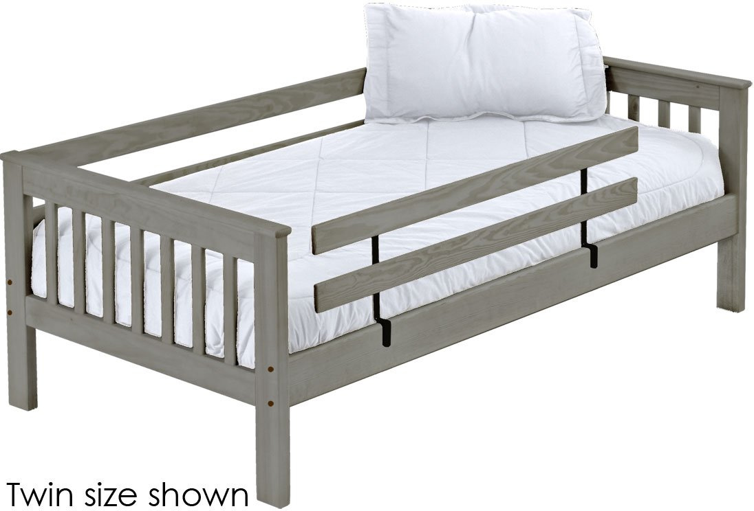 A full length rear guardrail and a removable front guardrail are included. Options include extra-long for big kids.