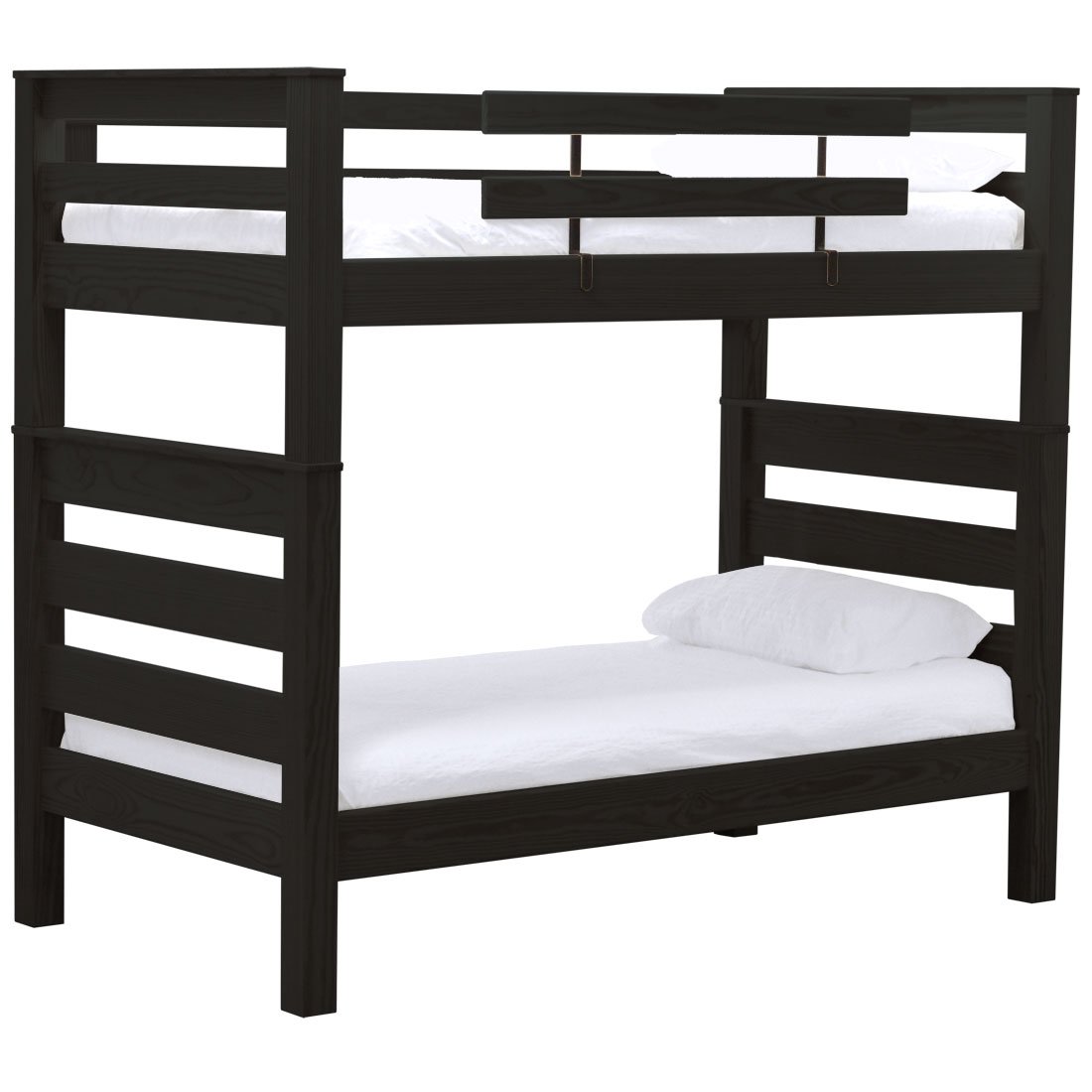 TimberFrame bunk beds feature massive corner posts with thick ladder rungs in between using mortise and tenon construction. A removable guardrail is included on the front with a full-length guardrail at the rear of the upper bed. Add optional drawers or a trundle bed for maximum use of your floor space. Ready for a mattress, no foundation required. The top of an 8” thick mattress on the lower bed will be 21” and on the upper bed will be 64” off the floor. All bunk beds and beds have been tested to accommodate over 450 pounds and are recommended for adult use.
