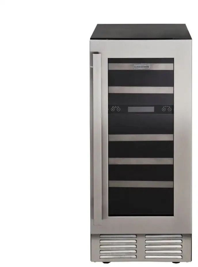 The Marathon 15” dual zone wine cooler offers a sleek luxurious design for those looking to maximize their space. With a 28-bottle capacity, there is ample room to store your favorite red and white wines controlled by two independent temperature zones. LCD display & control panel, automatic gradual white LED lighting, and full extension ball bearing shelves make operation quick and simple. A zero clearance and reversible hinge make it easy to fit beautifully into cabinetry without sacrificing precious cupboard space.Read More