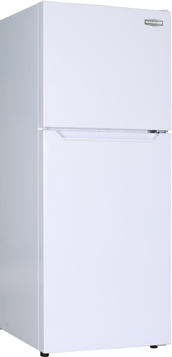 The Marathon 12.0 cu.ft. Deluxe White Frost Free Refrigerator combines performance and style in a convenient 24" W x 60" H size. Features include 2 adjustable tempered glass shelves, 2-bottle chrome wine rack, adjustable door bins and gallon storage, with two transparent crisper drawers to keep your food items organized.Read More