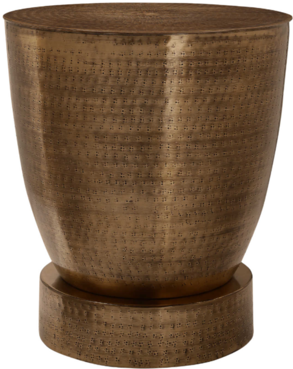 Add some dazzle and fashionable style to a room with this unique 22" (55.88cm) high, drum shaped accent table on a round metal base. The copper metal finish with a hammered pattern on all sides captures a boho-chic feel in a classic style. Bring it into the bedroom and use it as a nightstand for stand-out style. Suitable for all decor styles, including contemporary and modern spaces, this durably designed metal table only requires minor assembly. This table is also backed with a 5 year limited warranty against manufacturer's defects ensuring that you have a quality piece of furniture in your home. For indoor use only.